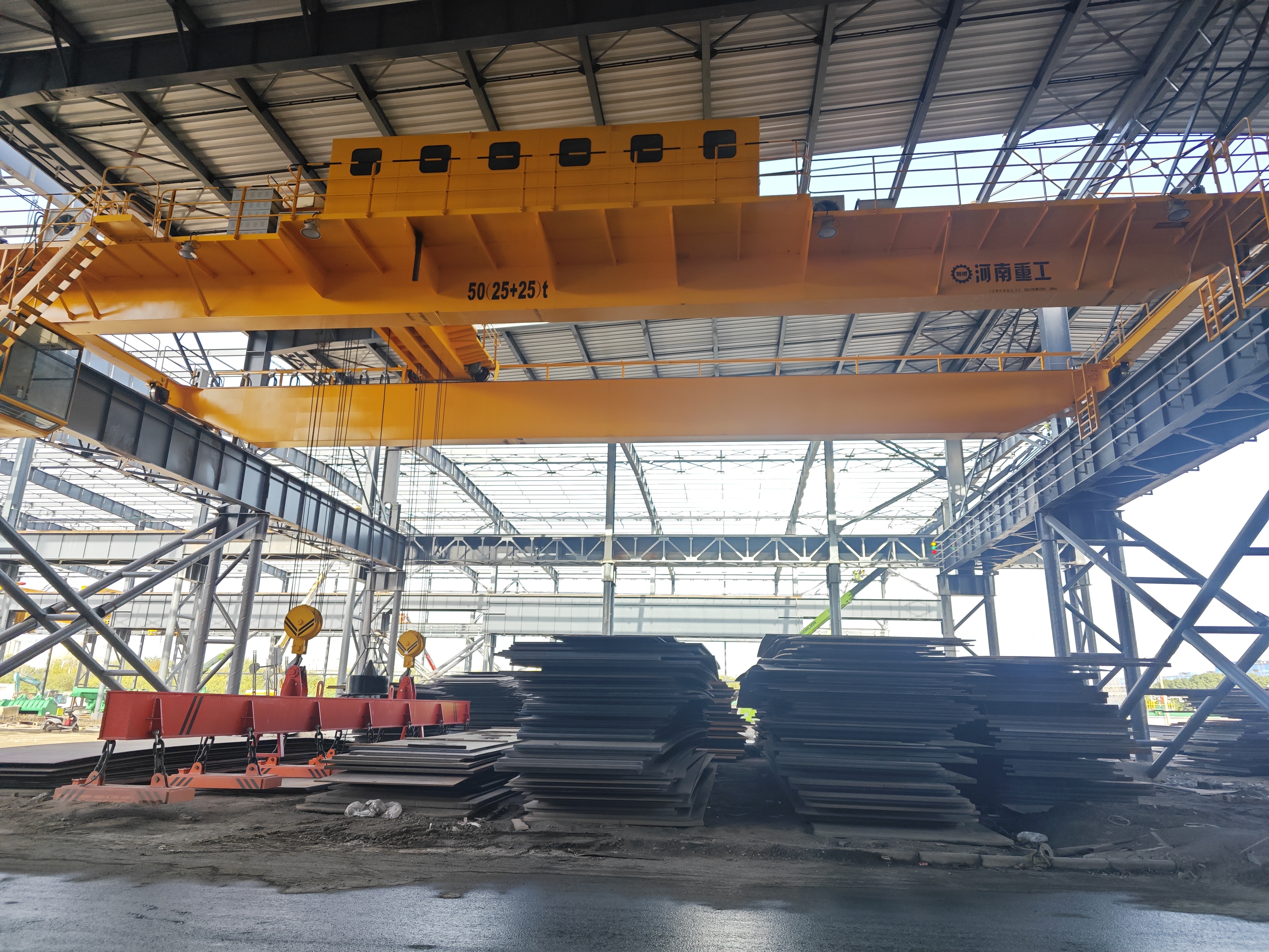 The electromagnetic overhead crane supplied by Zhonggong Group has been successfully installed and officially put into operation at a steel enterprise. The electromagnetic overhead crane is mainly used for handling steel plates and other magnetic materials. Featuring a double girder overhead crane structure combined with a high-performance electromagnetic lifting beam, the crane enables the lifting of multiple steel plates at one time, significantly improving material handling efficiency and reducing manual operations. During operation, the crane runs smoothly with strong magnetic force and stable load control. Equipped with essential safety protection devices, it fully meets the requirements of high-frequency and heavy-duty operations in steel production.