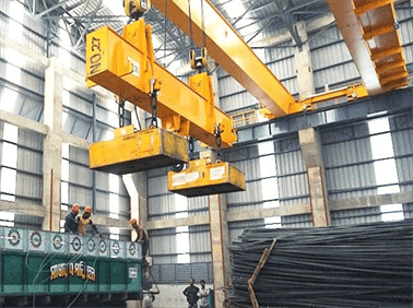 Rotating Trolley Magnet Crane is equipped with rotating hanging beam, which is suitable for loading, unloading and handling steel plate, section steel, coil and other materials in the indoor or open space of steel works, storage yard and storage.Suitable for hoisting of different specifications and the occasion of horizontal rotation.Hanging beam can be carried under the electromagnetic sucker, clamp and other spreader.